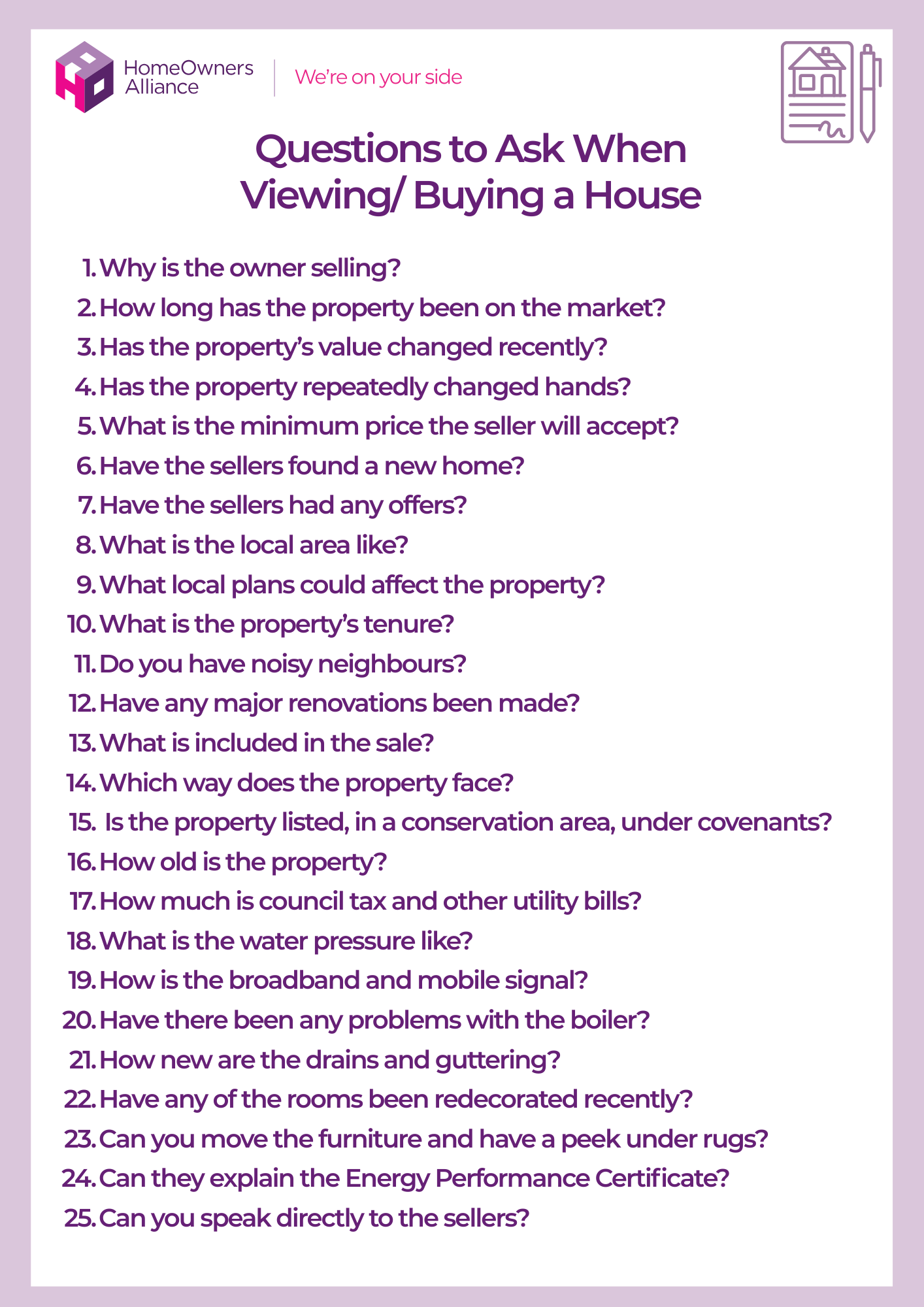 Prefer a print out? Download and save our 25 Questions to Ask When Viewing/Buying a House– and tick things off as you go.