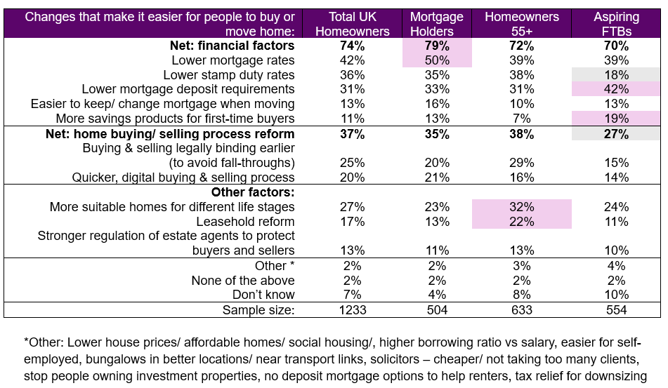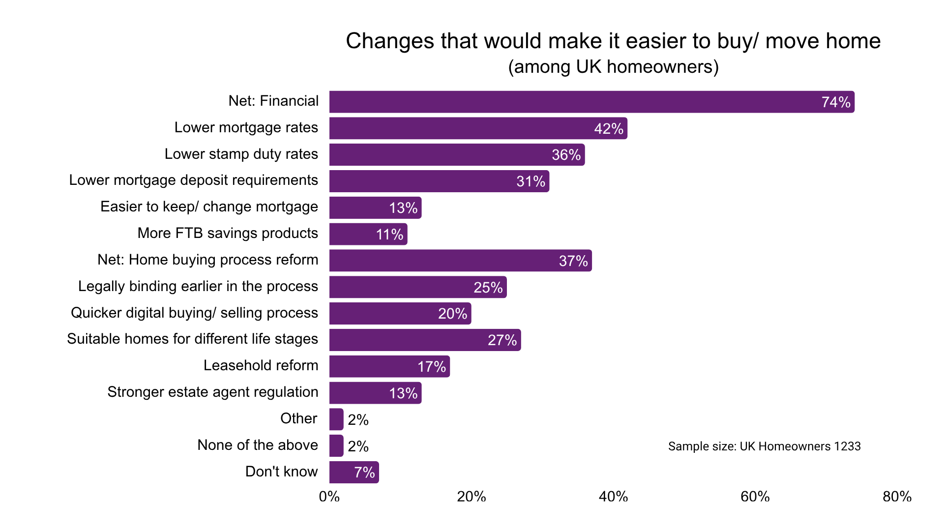 Homeowners aged 55 and over are particularly focused on the availability of suitable homes and inefficiencies in the process. Around a third (32%) say a better supply of later-life housing, such as bungalows, would encourage them to move, compared with 27% of homeowners overall.